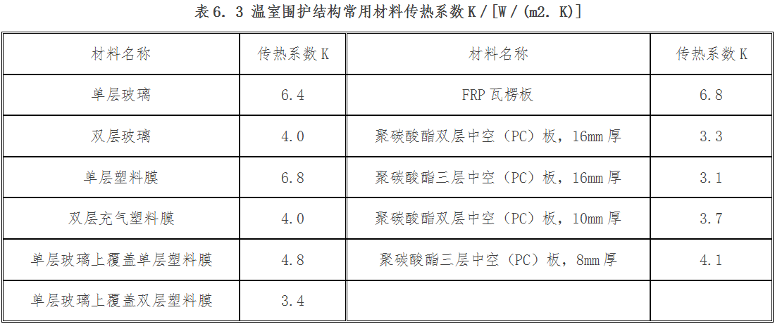 對(duì)于單一材料的圍護(hù)結(jié)構(gòu),材料的傳熱系數(shù)K可直接從有關(guān)手冊(cè)查取。表6.3列出了溫室圍護(hù)常用透光覆蓋材料傳熱系數(shù)。對(duì)特殊溫室透光覆蓋材料,應(yīng)咨詢生產(chǎn)廠家。