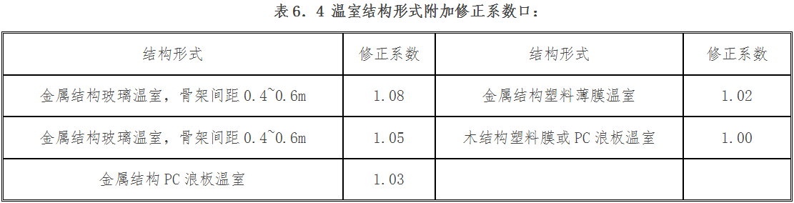 (1)結(jié)構(gòu)形式修正(α1) 溫室透光覆蓋材料必須有相應(yīng)的結(jié)構(gòu)支撐。目前支撐結(jié)構(gòu)的材料多為金屬,主要為鋁合金。相比透光覆蓋材料,鑲嵌這些覆蓋材料的金屬材料其傳熱速度和傳熱量都高,而且鑲嵌覆蓋材料所用的鋁合金條越多,附加傳熱量就越大。此外,溫室的天溝、屋脊、窗框和骨架等都是增大傳熱量的因素。工程計(jì)算中,統(tǒng)一考慮上述因素,采用結(jié)構(gòu)形式附加傳熱量進(jìn)行修正,不同溫室結(jié)構(gòu)形式的附加修正系數(shù)見表6.4。