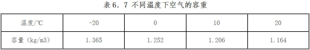 上式中N與V的乘積是以m3/h為單位的換氣速率。不同結(jié)構(gòu)溫室的換氣次數(shù)見表6.6。同溫度下空氣的容重如表6.7。
