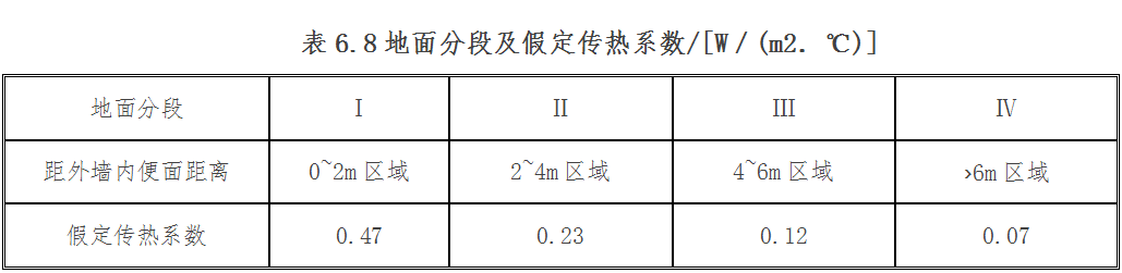 鑒于外界氣溫對(duì)地面各段傳熱影響不同,地面?zhèn)鳠嵯禂?shù)也隨之各異,靠近外墻的地面,由于熱流經(jīng)過的路程較短,熱阻小,傳熱系數(shù)就大,而距外墻較遠(yuǎn)的地方傳熱系數(shù)就小。根據(jù)實(shí)驗(yàn)知道,在距外墻6m以內(nèi)的地面,其傳熱量與距外墻的距離有較顯著的關(guān)系,6m以外則幾乎與距離無(wú)關(guān)。因此,在工程中一般采用近似計(jì)算,將距外墻8m以內(nèi)的地段分為每2m寬為一地帶,如圖6.1。在地面無(wú)保溫層的條件下,各帶的傳熱系數(shù)如表6.8。