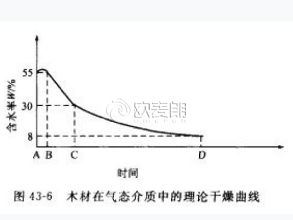 在減速干燥階段,表層的含水率低于纖維飽和點(diǎn),由內(nèi)層向表面移動(dòng)的水分?jǐn)?shù)量小于表面的蒸發(fā)強(qiáng)度,干燥速度逐漸緩慢,到干燥終了時(shí)等于零,打到平衡含水率。此階段中主要是纖維內(nèi)層的水分向外界排放,溫度不需要、段的烘干溫度設(shè)計(jì)在65℃,烘干時(shí)間約為60小時(shí),濕度控制在30%~40%之間。