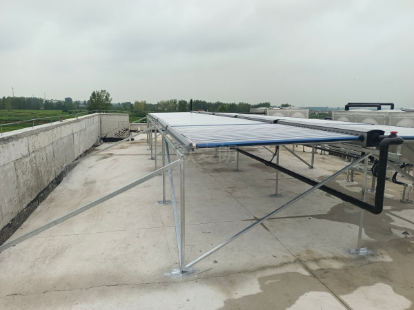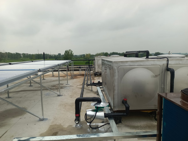項目配置:5組58*1800-50G太陽能集熱器+1臺歐麥朗空氣源熱泵+1個方形集熱水箱+1個方形恒溫水箱