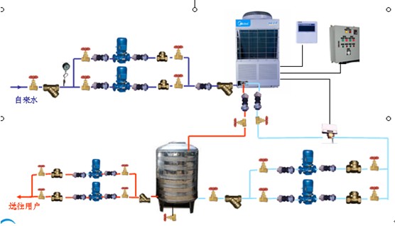 中央熱水供應(yīng)系統(tǒng)則一般由主機(jī)、保溫儲(chǔ)水箱、熱水增壓泵、循環(huán)水泵、截止閥、電磁閥、單向閥、系統(tǒng)水管道等設(shè)備、零部件組成。