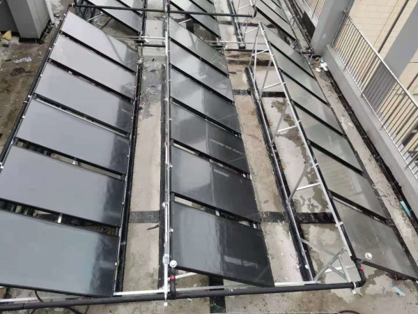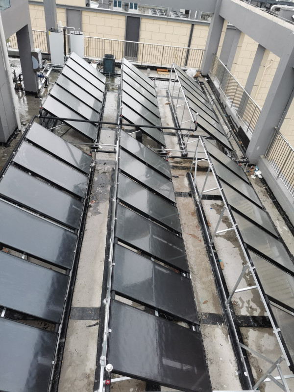 這套系統(tǒng)是開式集中式的太陽能集熱系統(tǒng)和多水箱閉式空氣能系統(tǒng)相結(jié)合。加大太陽能水箱可以增加太陽能的能效,增加儲熱水罐的儲水量,同時水箱采用開式水箱從而減輕水箱自重帶來的承重負荷。而供水水箱則采用分散式閉式多個小水箱,其優(yōu)點在于加大用水量的同時,減少了屋面荷載。并且單個水箱占地面積小,可以自由排布,適應各種安裝環(huán)境;而且用水末端承壓出水,不需要靠增加供水水泵來加壓供水,使得整個系統(tǒng)更加節(jié)能,用水末端更加舒適。