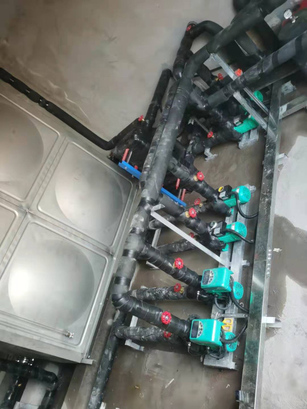 項(xiàng)目配置:采用80塊平板太陽(yáng)能集熱器+兩臺(tái)7P低溫空氣能熱泵+一個(gè)8噸方形保溫水箱