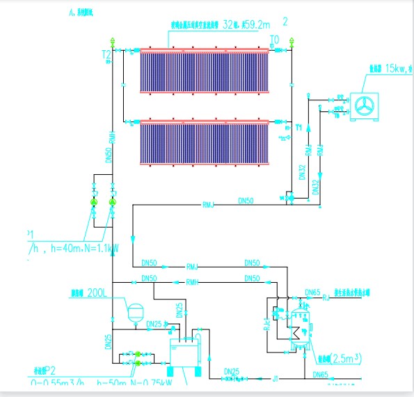 系統(tǒng)運(yùn)行原理圖:(超導(dǎo)集熱器+容積式換熱器+燃?xì)忮仩t輔助系統(tǒng))