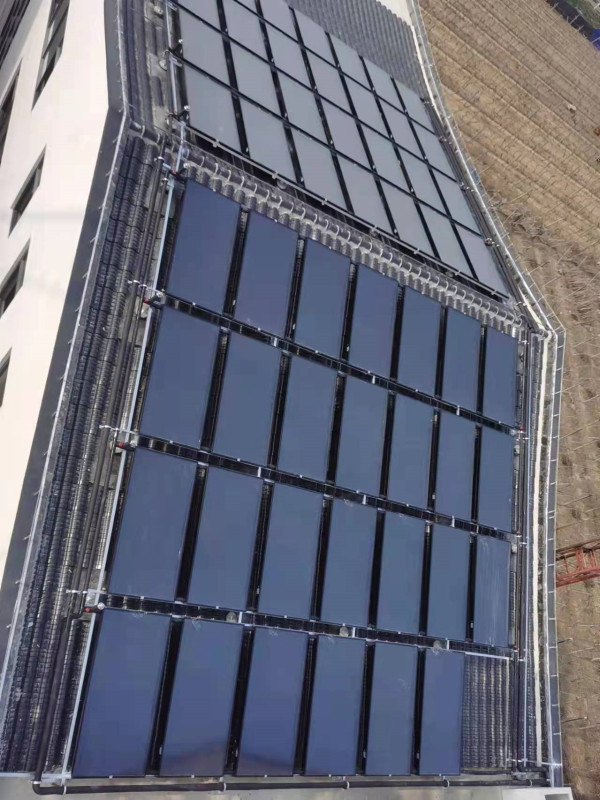 【整套系統(tǒng)配備哦55組平板太陽能+18噸方形保溫儲熱水罐+3臺“OML-050A-II”的空氣能熱泵+2臺變頻供水增壓泵】,考慮到該項目為衛(wèi)生服務(wù)中心,熱媒循環(huán)管道都采用的是304不銹鋼管道及配件。