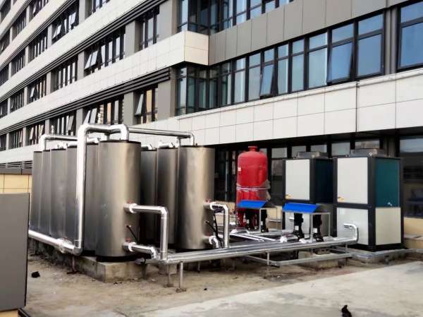 在晴好天氣時(shí),太陽(yáng)能對(duì)保溫水箱加熱,使保溫水箱內(nèi)的水溫升高,保溫水箱內(nèi)的溫度達(dá)到設(shè)定的溫度值,會(huì)通過(guò)水泵將水泵入到承壓儲(chǔ)熱水箱,以此達(dá)到直接利用儲(chǔ)熱水箱內(nèi)的熱水。若在連續(xù)陰、雨天或太陽(yáng)不足的情況下,太陽(yáng)能吸收的熱量不能滿(mǎn)足熱負(fù)荷的需要,則自動(dòng)啟動(dòng)空氣源對(duì)儲(chǔ)熱水箱加熱至指定溫度(55度,可調(diào)節(jié)),當(dāng)達(dá)到指定溫度后,設(shè)備自動(dòng)停止工作,以最大化節(jié)約能源,同時(shí)保證系統(tǒng)熱水的正常供應(yīng).