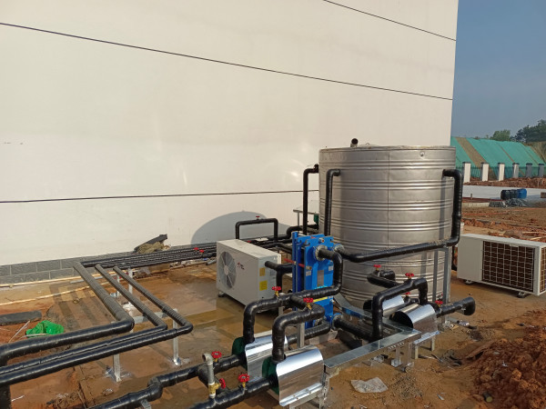 系統(tǒng)優(yōu)勢(shì):在晴好天氣時(shí),太陽(yáng)能集熱器將吸收的太陽(yáng)能熱量通過板式換熱器將熱量轉(zhuǎn)換到保溫水箱,對(duì)保溫水箱里的水加熱,使保溫水箱內(nèi)的水溫升高,保溫水箱內(nèi)的溫度達(dá)到設(shè)定的溫度值,以此達(dá)到直接利用儲(chǔ)熱水箱內(nèi)的熱水。若在連續(xù)陰、雨天或太陽(yáng)不足的情況下,太陽(yáng)能集熱器吸收的熱量不能滿足熱負(fù)荷的需要,則自動(dòng)啟動(dòng)空氣源對(duì)儲(chǔ)熱水箱加熱至指定溫度(55度,可調(diào)節(jié)),當(dāng)達(dá)到指定溫度后,設(shè)備自動(dòng)停止工作,以最大化節(jié)約能源,同時(shí)保證系統(tǒng)熱水的正常供應(yīng).系統(tǒng)已安裝調(diào)試完畢。