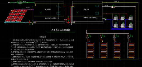 4、供熱系統(tǒng)設(shè)計以太陽能為主,空氣源(6臺25P高溫熱泵)為輔的供熱模式;保證全年、全天候24小時供熱,恒溫出水,即開既熱;