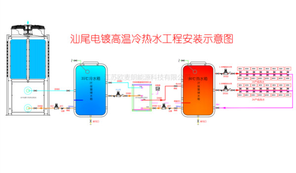 此次定制的50匹高溫水源熱泵機(jī)組是為廣東汕尾電鍍廠加熱恒溫系統(tǒng)配套使用,客戶要求加熱溫度80度,歐麥朗工程師設(shè)計(jì)采用分體式復(fù)疊(雙級耦合)高溫?zé)岜眉訜嵯到y(tǒng)。第壹級配置一臺50匹空氣源熱泵機(jī)和一只2噸的保溫低溫水箱,將水箱溫度維持在35-40度。第二級配置定制的50匹高溫水源熱泵機(jī)組和一只2噸的保溫高溫水箱,將水箱溫度維持在80-85度。空氣源熱泵加熱的低溫水箱作為高溫水源熱泵的熱源,加熱2噸高溫水箱。達(dá)到蕞大化的節(jié)能效果。