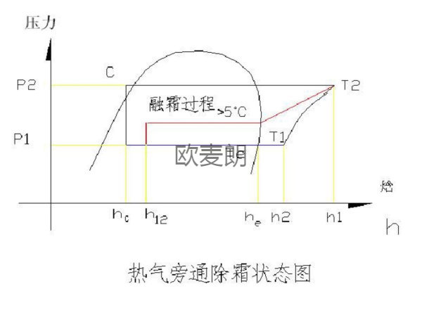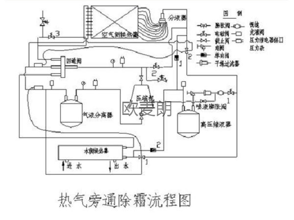 當進入除霜程序時,機組仍保持制熱工作循環(huán),在壓縮機的排氣側(cè)分出一股高溫氣體進入需要除霜的空氣側(cè)換熱器,使高溫氣體在高于 5℃發(fā)生相變放出潛熱達到除霜目的(見以上熱氣旁通除霜狀態(tài)圖)。除霜后的制冷劑液體進入另外一側(cè)正常制熱的換熱器繼續(xù)蒸發(fā),這樣,這部分制冷劑仍發(fā)揮了制熱的功效,蒸發(fā)后變?yōu)闅怏w避免了壓縮機因除霜造成的回液可能。若因某種原因造成除霜不停止時,高溫氣體不直接回到壓縮機,而是進入另外一側(cè)正常制熱的換熱器,此時制熱膨脹閥將會根據(jù)過熱度的變化自動增加供液量,從而使壓縮機的吸氣保持在合適的過熱度范圍內(nèi)。在整個除霜過程中,由于避免了機組制冷循環(huán)和制熱循環(huán)的相互轉(zhuǎn)換,壓縮機的吸、排氣狀態(tài)基本保持穩(wěn)定。以上就是歐麥朗熱氣旁通除霜技術(shù)。