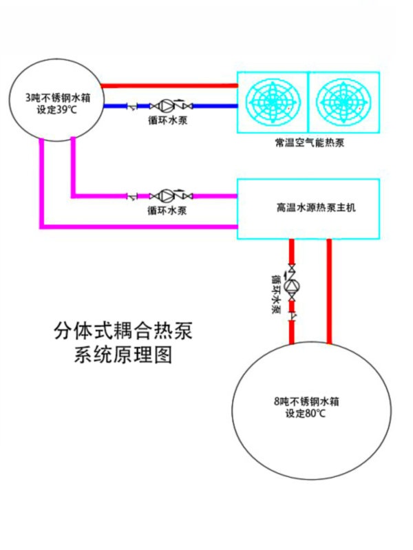 具體的耦合方式為:空氣能熱泵加熱3噸水箱,將水箱溫度維持在20-30℃提供低位能源,由水源熱泵二次提溫到80℃。此系統(tǒng)不但可以滿(mǎn)足需求,而且能源消耗低,后期的運(yùn)行成本也節(jié)省,還可以實(shí)現(xiàn)整個(gè)系統(tǒng)全自動(dòng)化運(yùn)行。