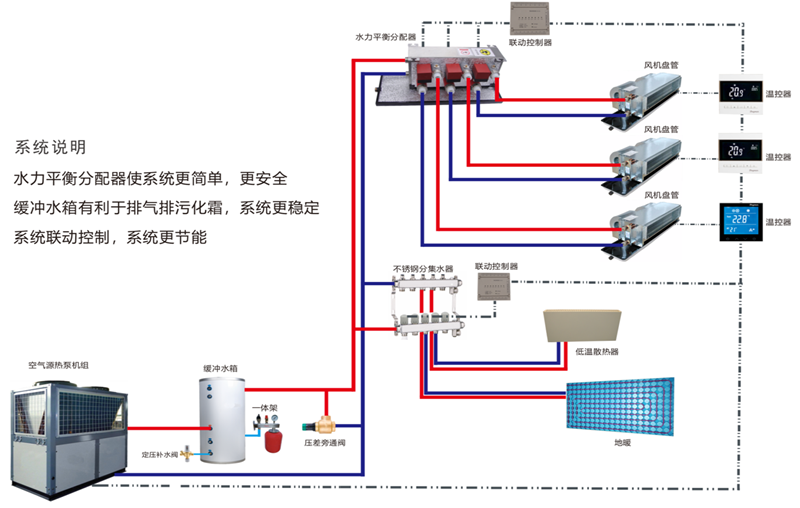 功能要求:配置風(fēng)冷模塊機組實現(xiàn)夏季制冷、冬季供暖。末端采用風(fēng)機盤管水系統(tǒng)。地暖熱泵實現(xiàn)冬天供暖。