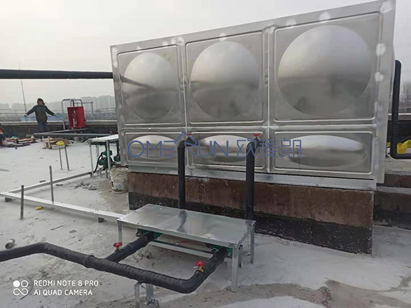 設(shè)備配置:配備一個(gè)3*3*1.5M的方形水箱+16組太陽能集熱器+150KW低碳冷凝模塊爐。