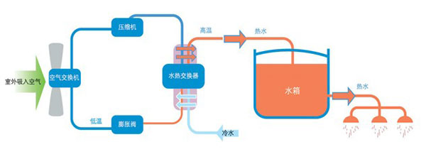 空氣源熱泵中央熱水機(jī)組是繼熱水鍋爐、燃?xì)鉄崴鳌㈦姛崴骱?a target='_blank' style='margin: 0px; padding: 0px; color: rgb(0, 0, 0); outline-style: none; text-decoration-line: none;'>太陽(yáng)能熱水器之后的新一代熱水制取裝置;它突破傳統(tǒng)熱水設(shè)備的工作原理,創(chuàng)造性地將熱泵原理應(yīng)用到機(jī)組上,利用壓縮機(jī)驅(qū)動(dòng)制冷工質(zhì)進(jìn)行逆卡諾循環(huán),從室外空氣中吸取熱量產(chǎn)生高品質(zhì)的熱水,滿足人們生活、生產(chǎn)的需要;空氣源熱泵熱水機(jī)組已廣泛的應(yīng)用在社會(huì)的各行各業(yè)。從政府機(jī)關(guān)到學(xué)校、醫(yī)院,從酒店、賓館到別墅、住宅小區(qū),隨處可見熱水機(jī)組的“身影”;利用空調(diào)制熱的原理制取生活熱水,不僅將電能轉(zhuǎn)換給熱水,還可以吸收空氣中熱能,效率高達(dá)460%。