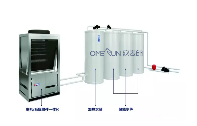 系統(tǒng)根據(jù)制冷壓縮機(jī)作功,空氣中能源遷移至水里,制冷劑不斷循環(huán)系統(tǒng),熱泵機(jī)組持續(xù)消化吸收能源,根據(jù)冷卻器開(kāi)展率傳熱,將能源傳送至封閉式水箱中;根據(jù)內(nèi)部流水循環(huán)系統(tǒng),將每一個(gè)控制模塊承壓水箱填滿(mǎn)熱水。