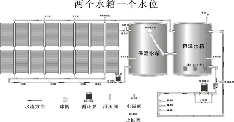 設(shè)備配置:一臺(tái)空氣源熱泵+多組太陽(yáng)能集熱器+集熱水箱+保溫水箱