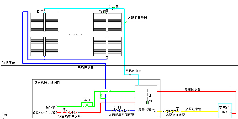 工程概況:南京某公司食堂及生活熱水原來采用的是蒸汽換熱產(chǎn)生的,鑒于蒸汽使用時(shí),熱力公司會根據(jù)低蒸汽流量來收取費(fèi)用,夏季蒸汽主要用來生產(chǎn)生活熱水,雖然耗熱量不大,但每個(gè)月熱力公司收取的費(fèi)用很高?,F(xiàn)在考慮7-9月份將蒸汽關(guān)閉,采用更經(jīng)濟(jì)節(jié)能的太陽能+空氣源熱泵的加熱方式,來滿足生活熱水需求。