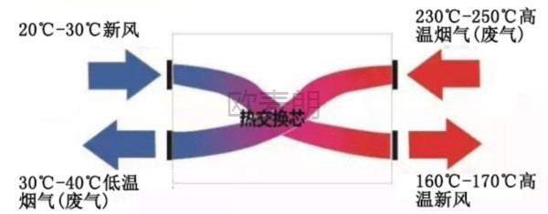 230度左右的高溫?zé)煔庥蛇M(jìn)氣口進(jìn)入換熱裝置,新風(fēng)由另一端的進(jìn)口進(jìn)入換熱器。換熱器內(nèi)部均勻分布有是多個(gè)高效的換熱裝置,通過串聯(lián)和并聯(lián)的方式組合在一起。新風(fēng)和廢氣在里面一層一層的換熱,換熱到末端時(shí),新風(fēng)出風(fēng)口會達(dá)到160度左右,廢氣出風(fēng)口溫度在30度左右。