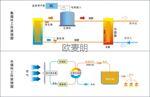 二、氟循環(huán):主機(jī)與水箱由銅管連接,依靠銅管內(nèi)的介質(zhì)輸送熱能到水箱,由介質(zhì)循環(huán)制熱的。