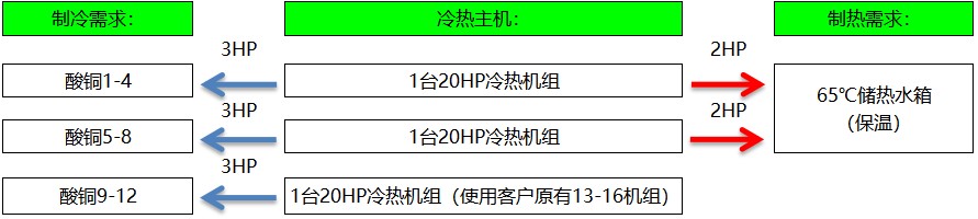 注:1、增加兩臺(tái)冷熱機(jī)組直接對(duì)應(yīng)酸銅1-4、5-8槽直接抽槽液制冷;